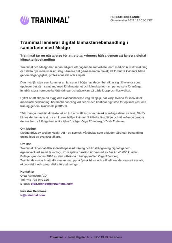 Trainimal och Medgo har sedan tidigare ett pågående samarbete inom medicinsk viktminskning och detta nya initiativ är ett steg närmare det gemensamma målet; att förbättra kvinnors hälsa genom tillgänglighet, professionalitet och empati.
